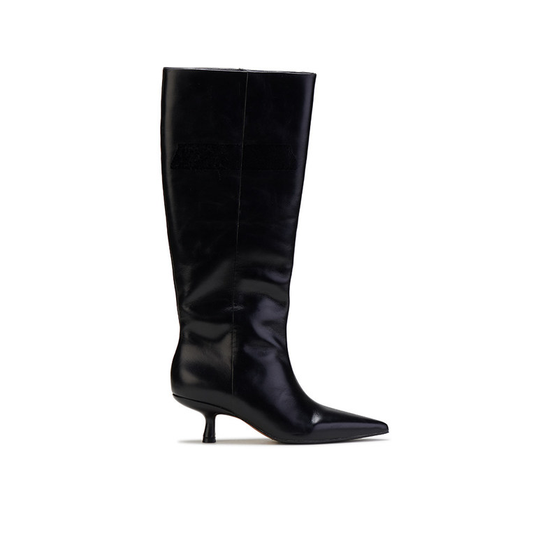काले चमड़े के घुटने-उच्च उंगली और स्टिलेटो ऊँची एड़ी के जूते